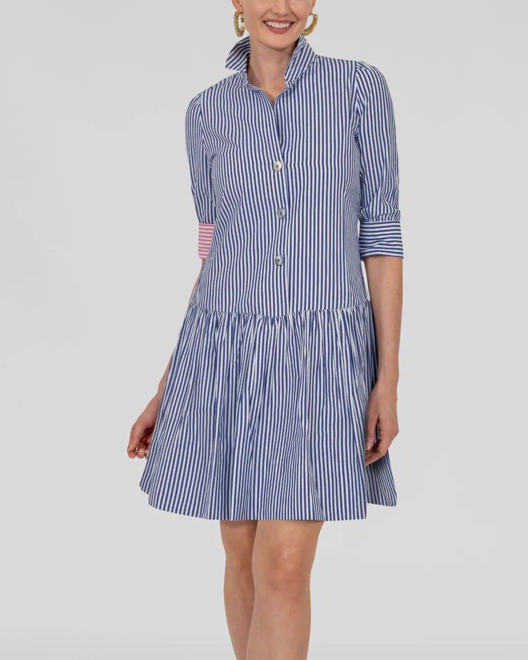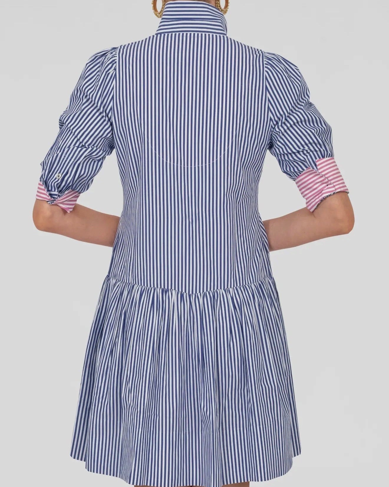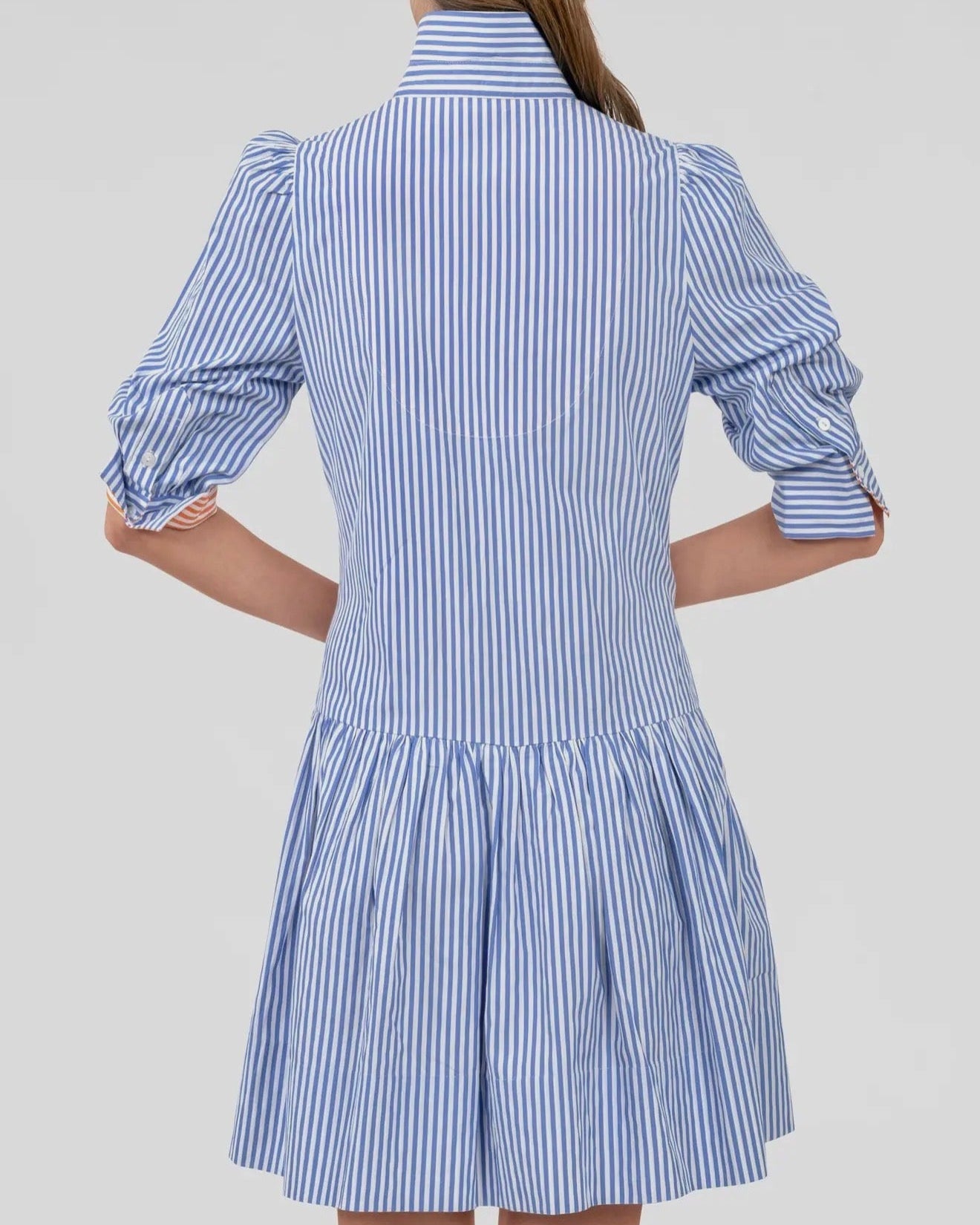 36" Length-Drop Gathered Skirt -3/4 Sleeves / Optional Contrast Turn Back Cuffs -Shiny Shell Buttons -Side Seam Pockets -4” Hand Hem -Contrasting