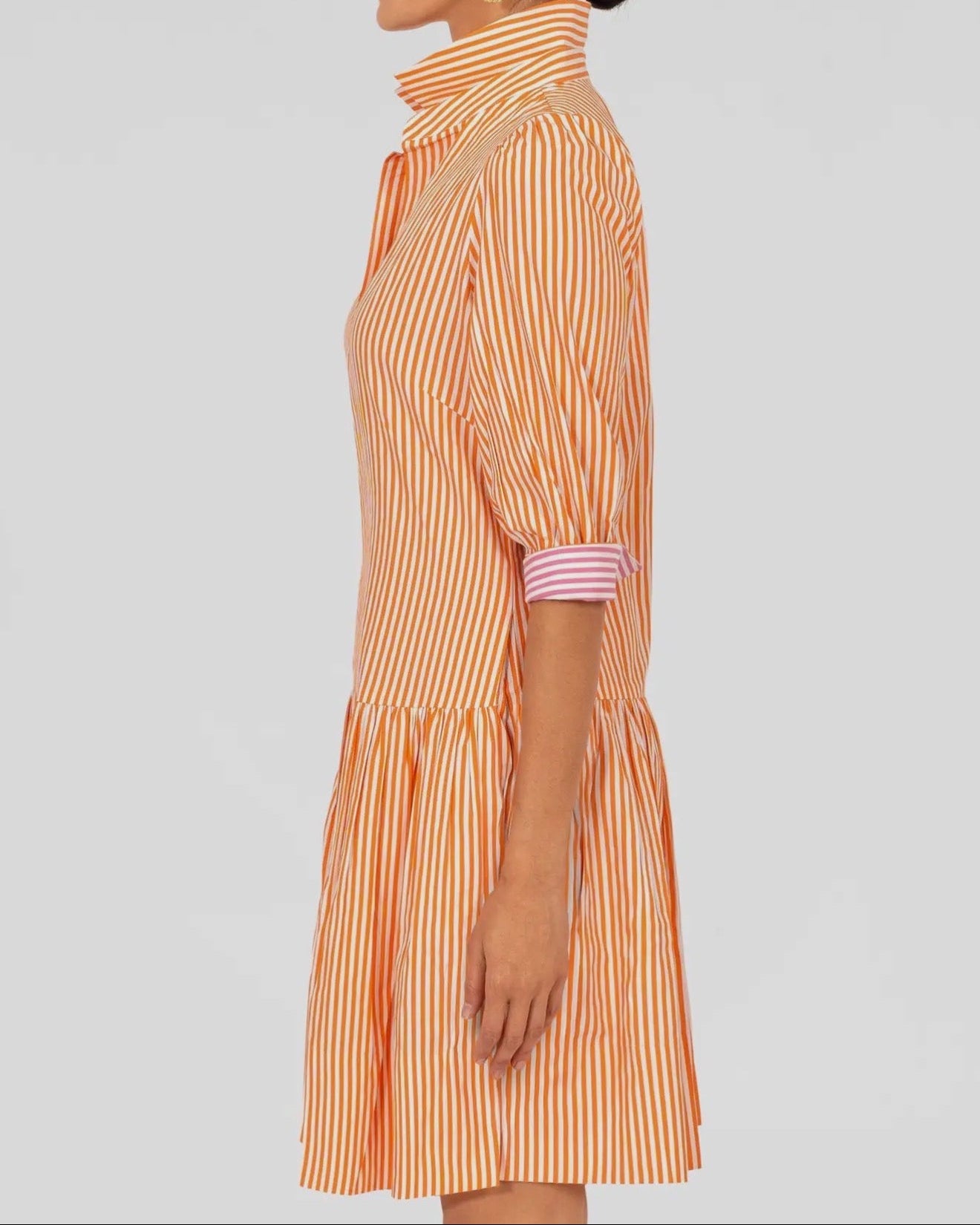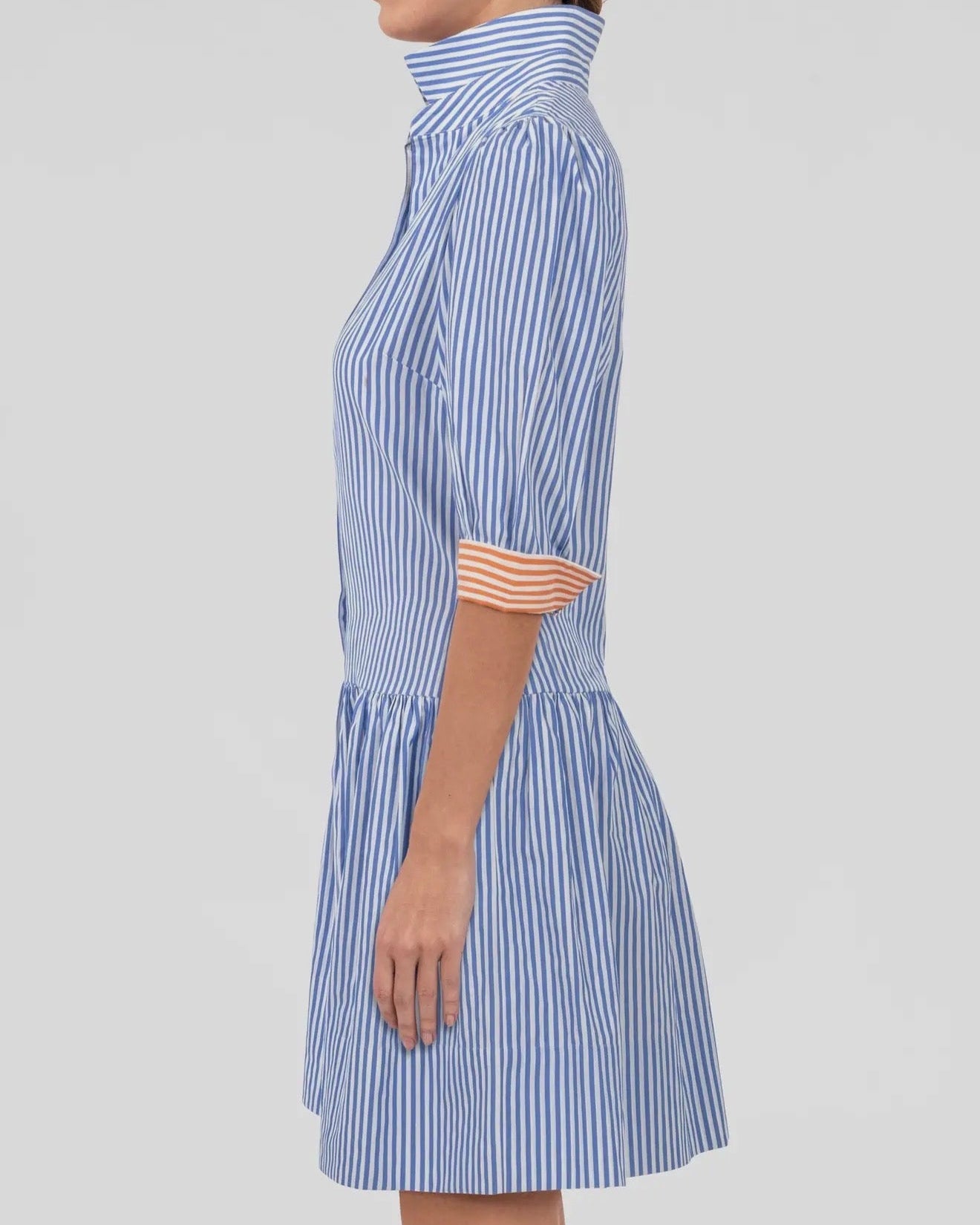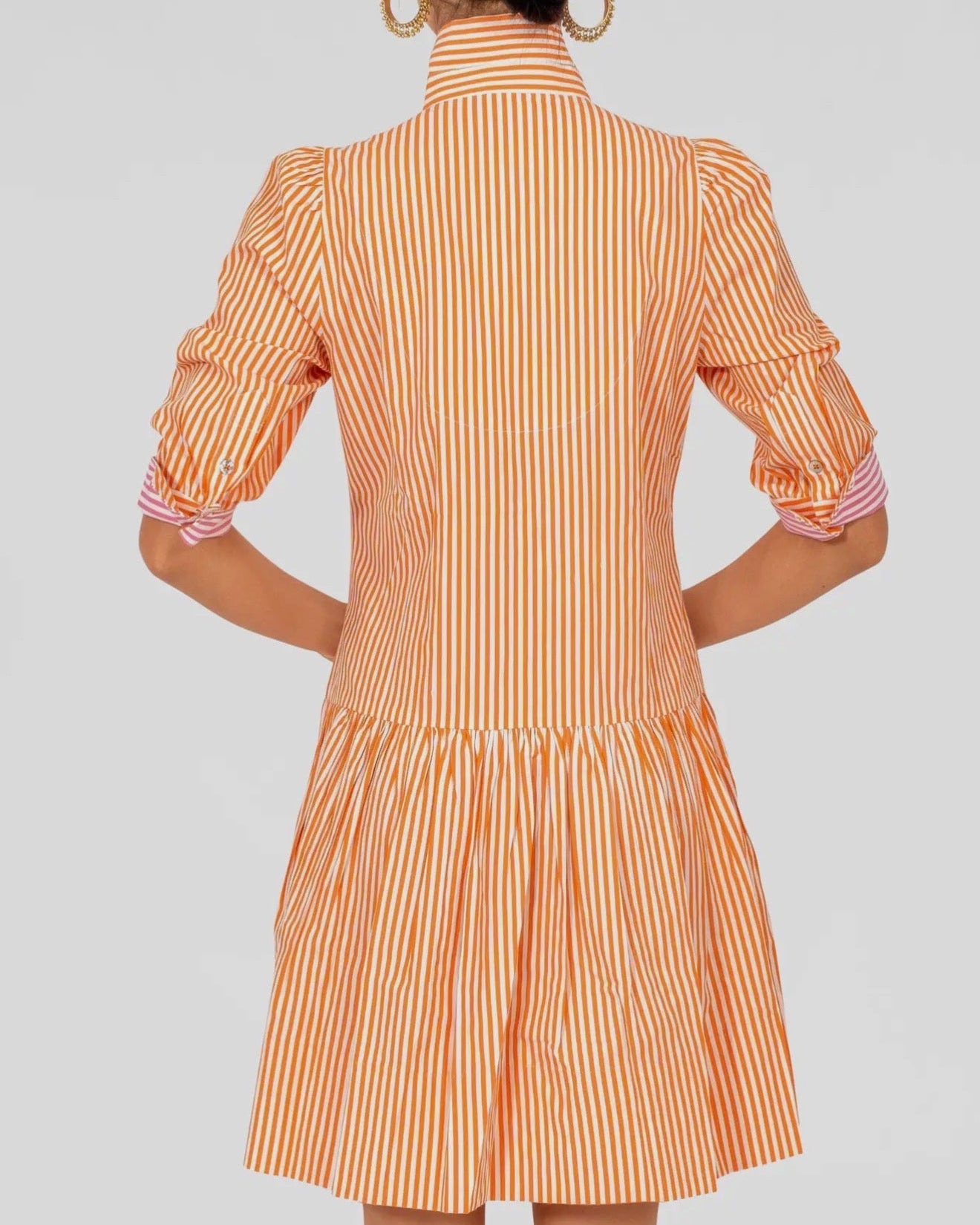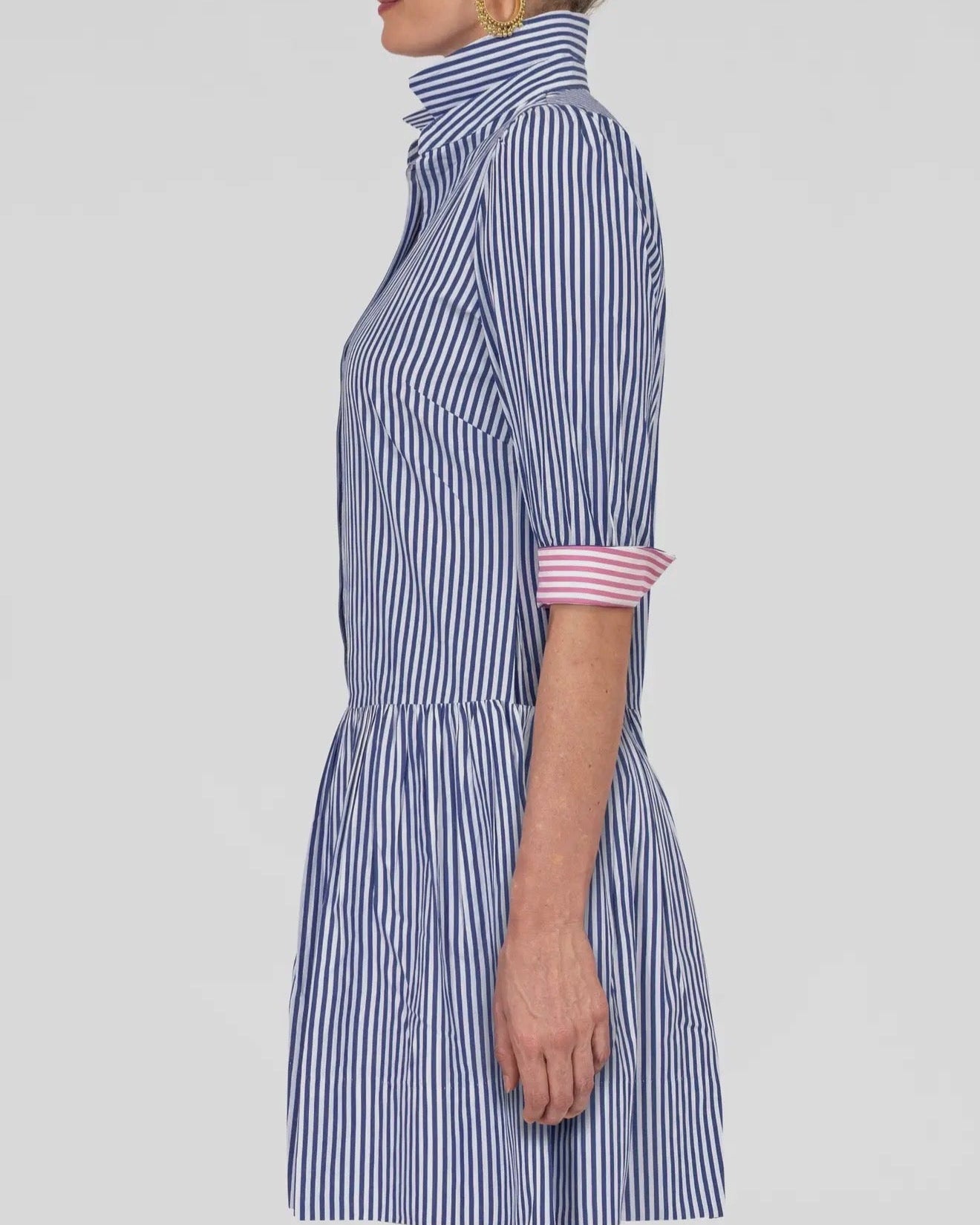 36" Length-Drop Gathered Skirt -3/4 Sleeves / Optional Contrast Turn Back Cuffs -Shiny Shell Buttons -Side Seam Pockets -4” Hand Hem -Contrasting