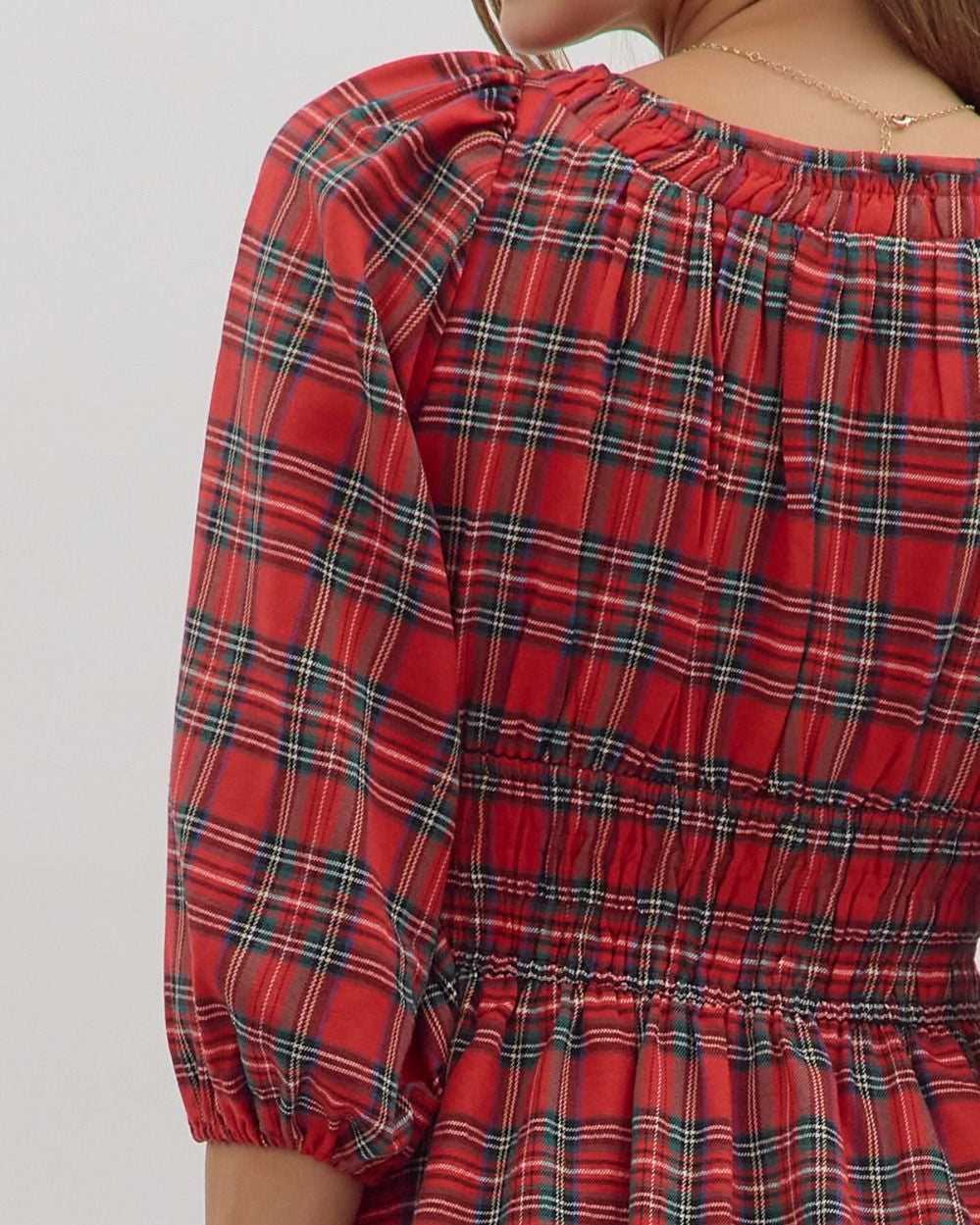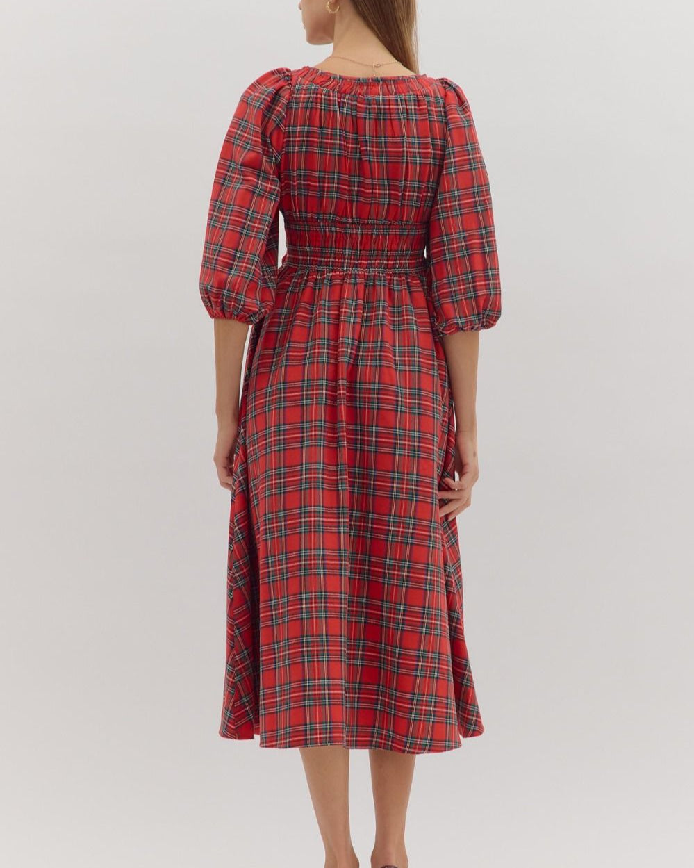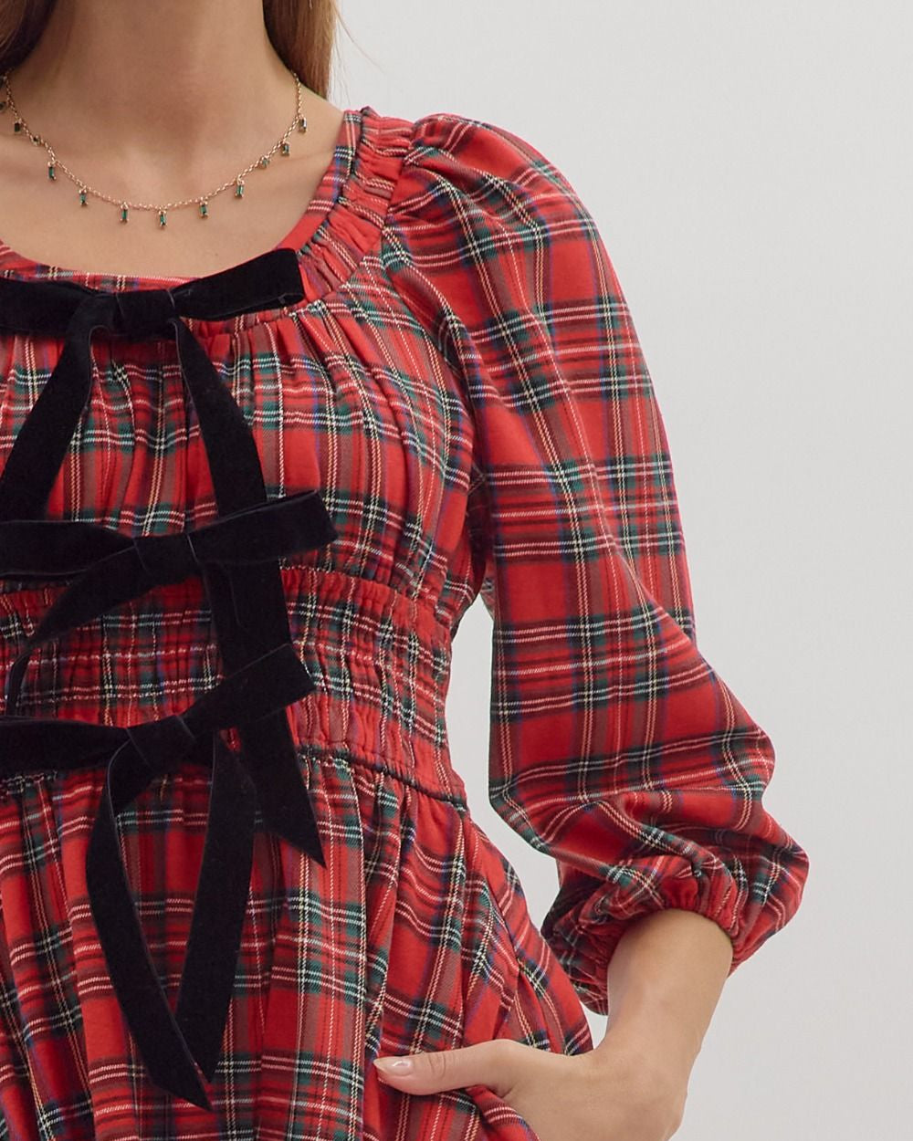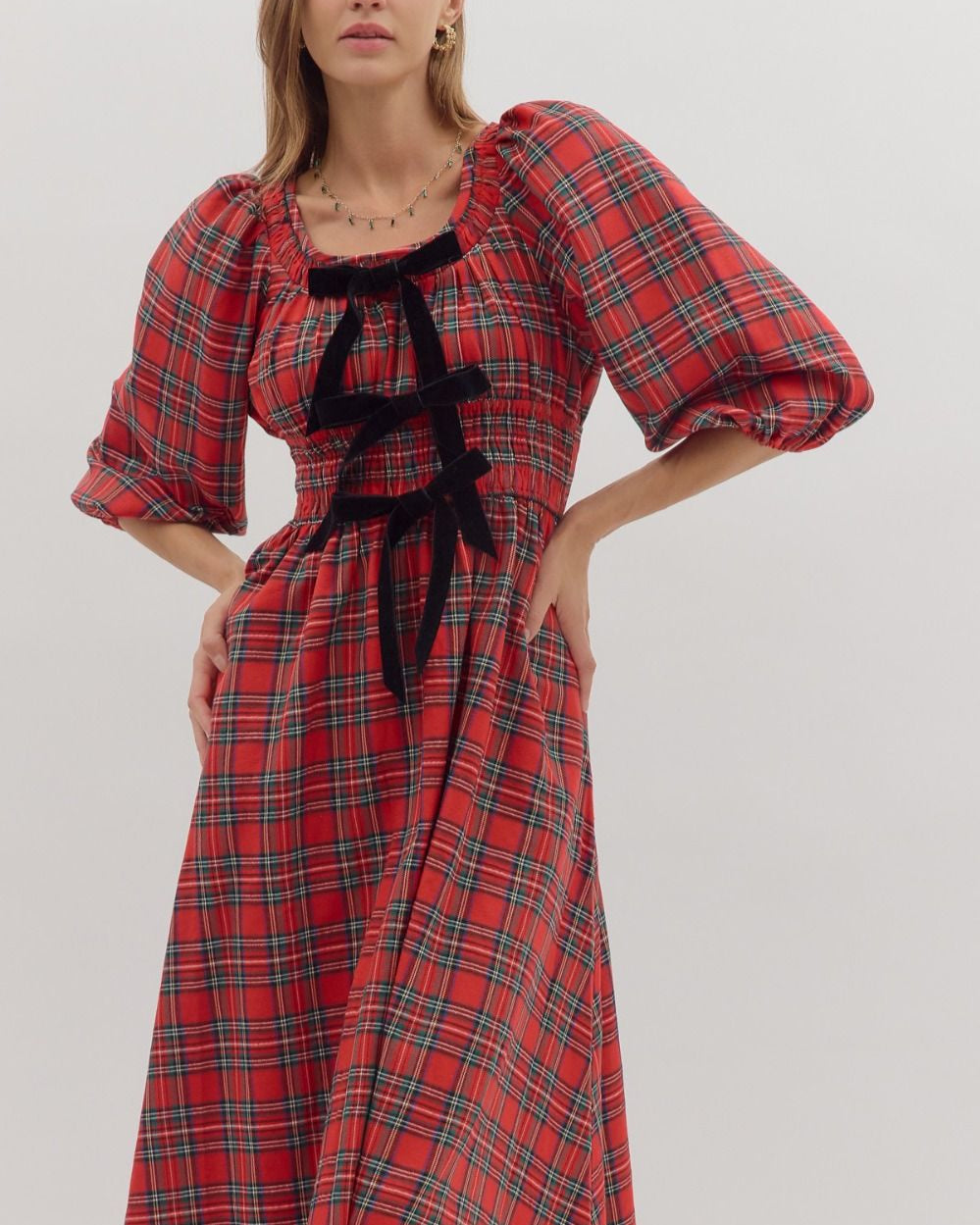 Plaid 3/4 puff sleeve midi dress featuring velvet bow detail at front and elasticated waistband. Side pockets. Lined. Woven. Non-sheer. Lightweight.