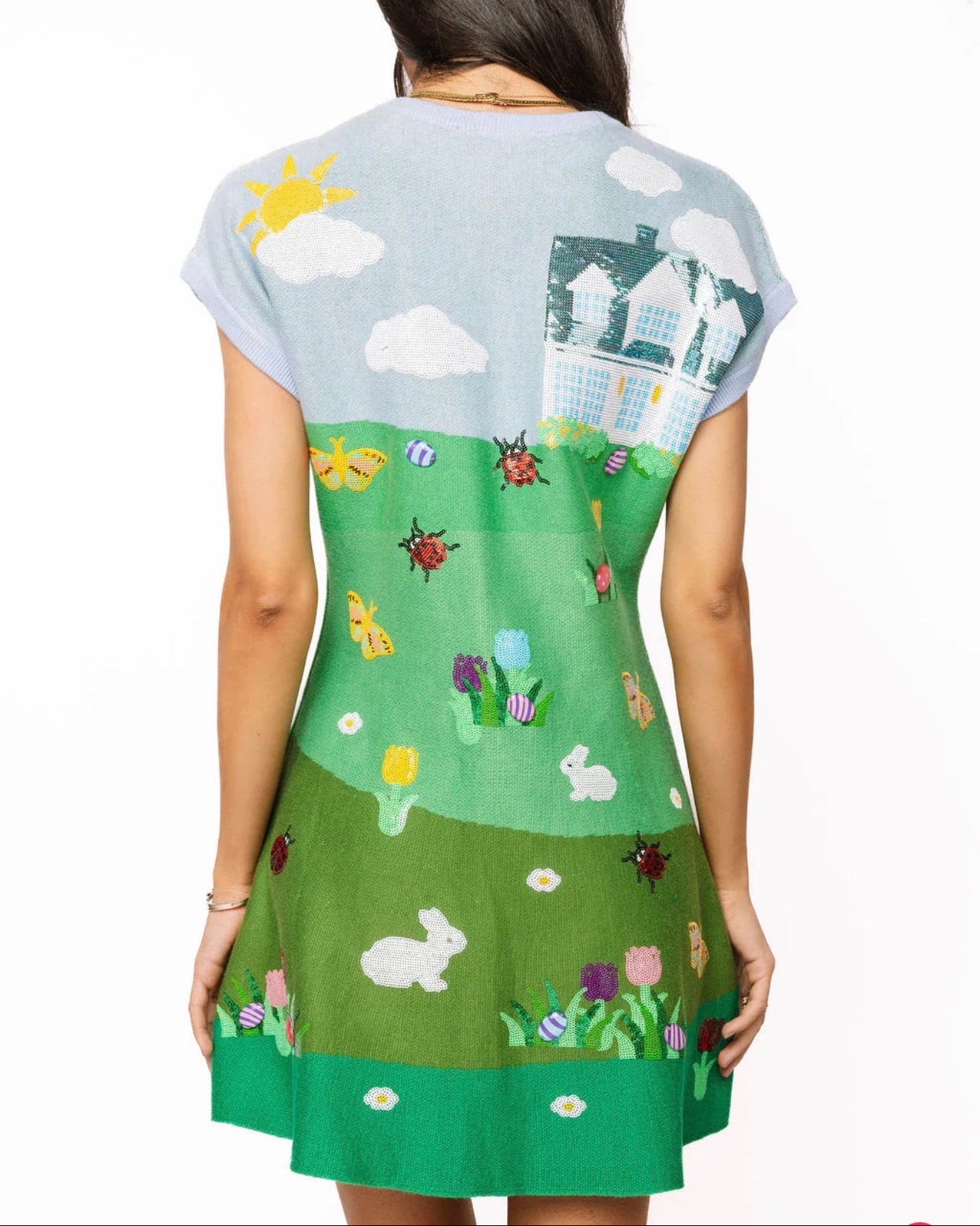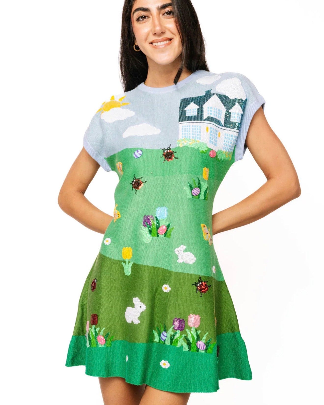 Hop into Easter weekend in style with this charming knit dress featuring a delightful yard scene complete with playful bunnies and colorful eggs. The soft, comfortable knit fabric moves with you through all your festive celebrations, while the whimsical design captures the joy and magic of the season. Perfect for family gatherings, Easter brunches, or spring festivities, this short-sleeve dress brings cheerful holiday spirit to your wardrobe. Make this Easter unforgettable with a dress as special as the occasion.