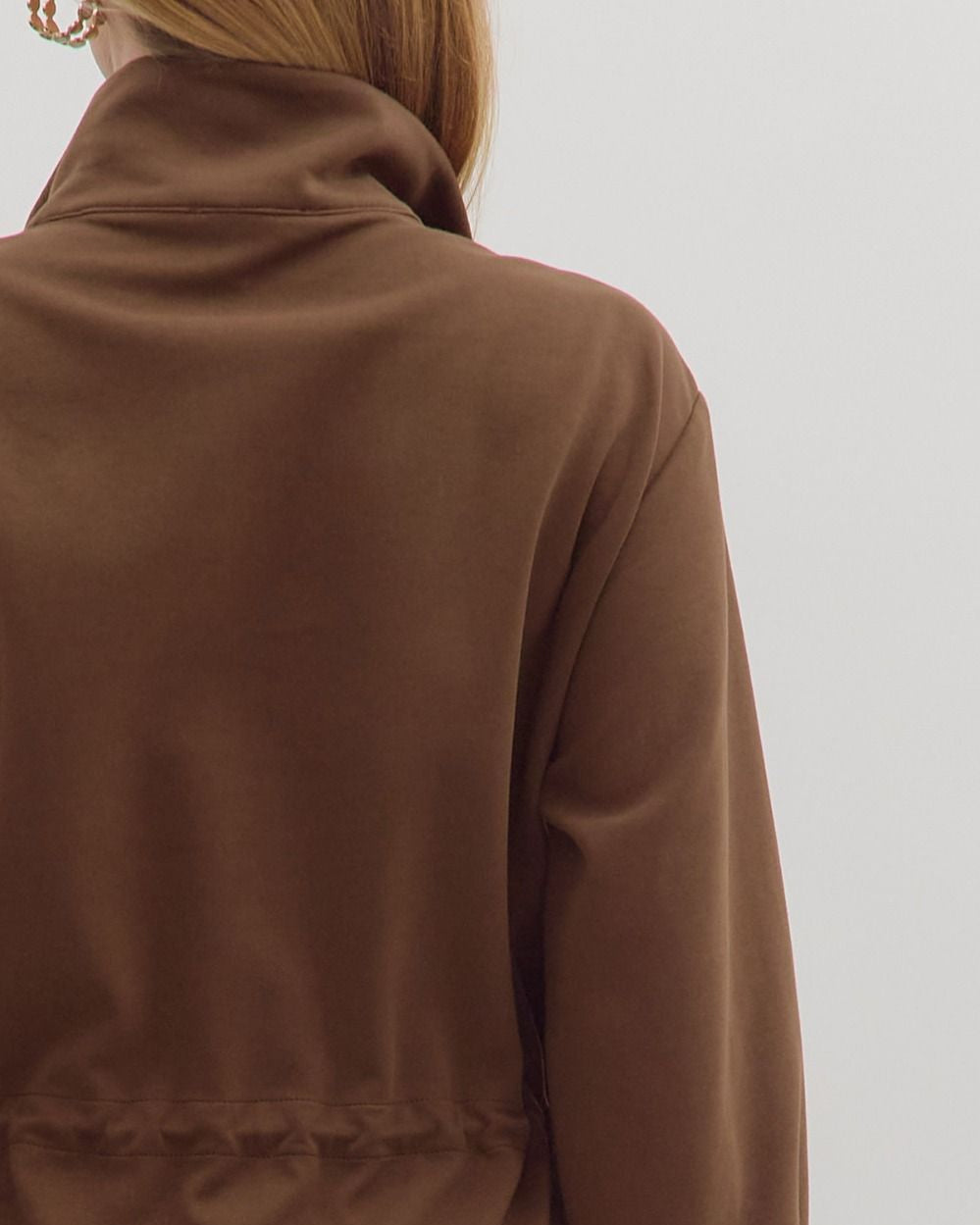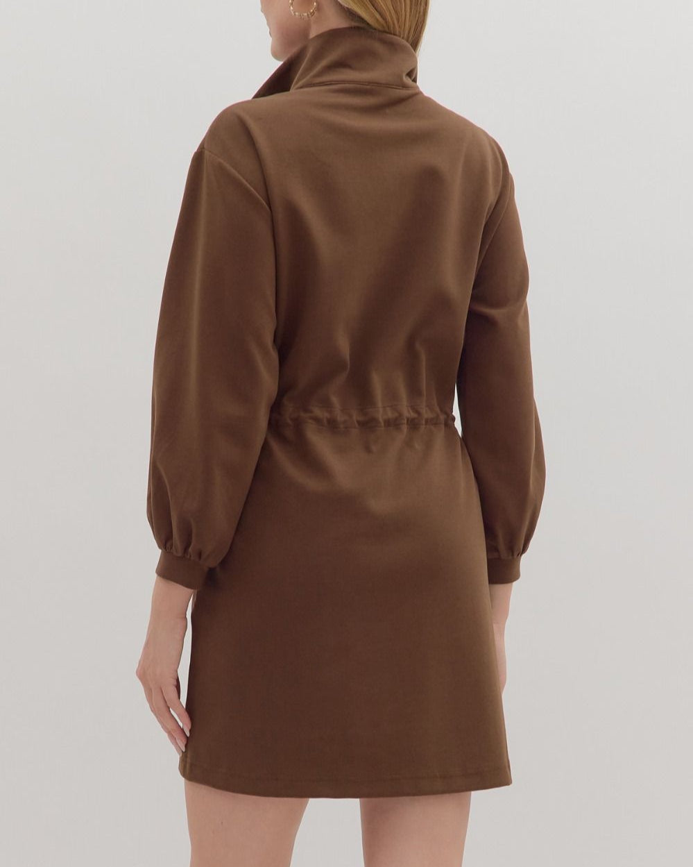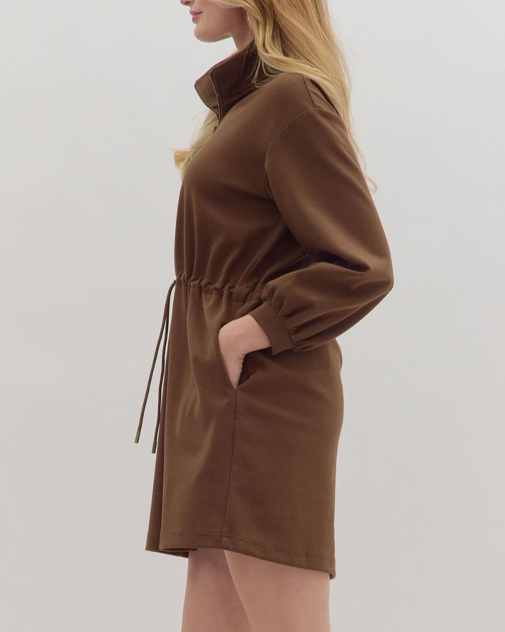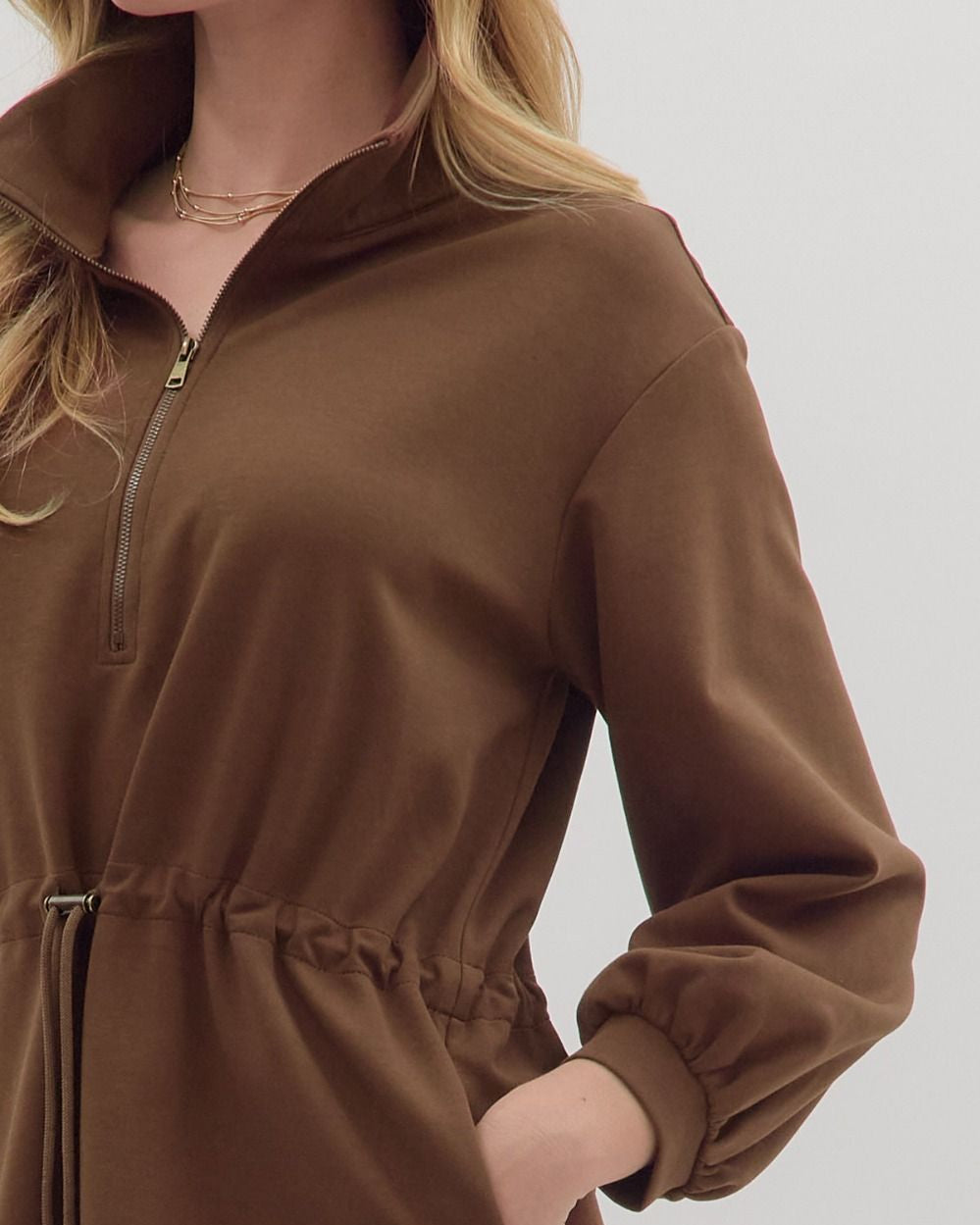 Solid long sleeve mini dress featuring half zip at front and adjustable drawstring waist. Side pockets. Unlined. Knit. Non-sheer. Medium weight.