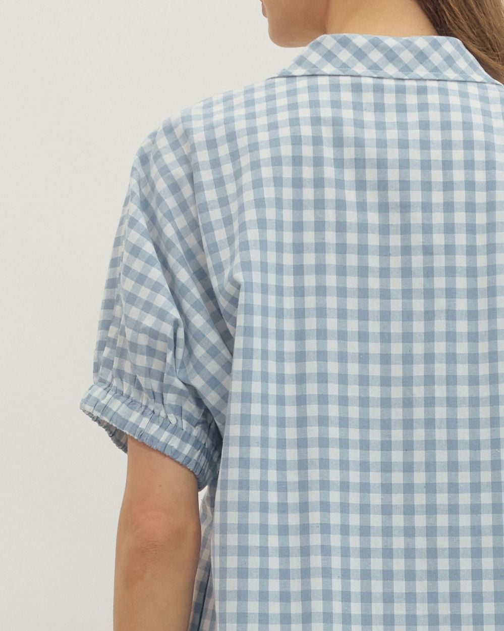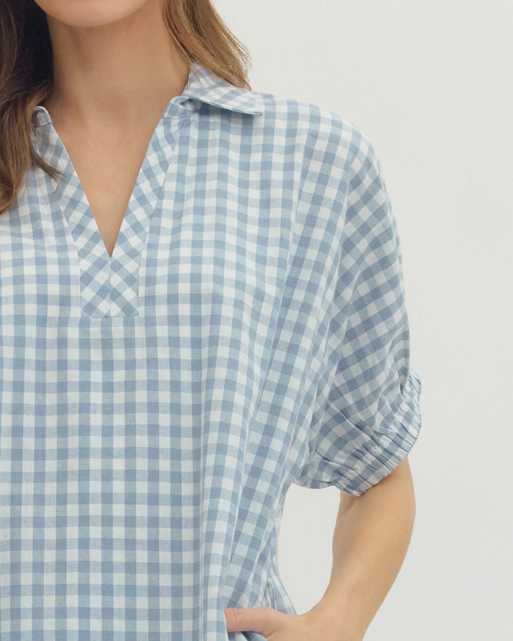 Gingham short sleeve mini dress featuring V-neck placket. Elasticated sleeve openings. Side pockets. Lined. Woven. Non-sheer. Lightweight.
