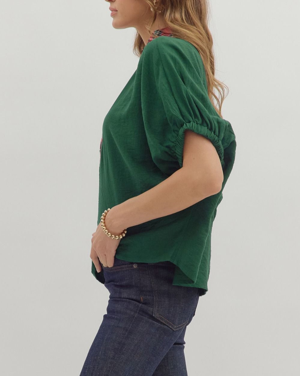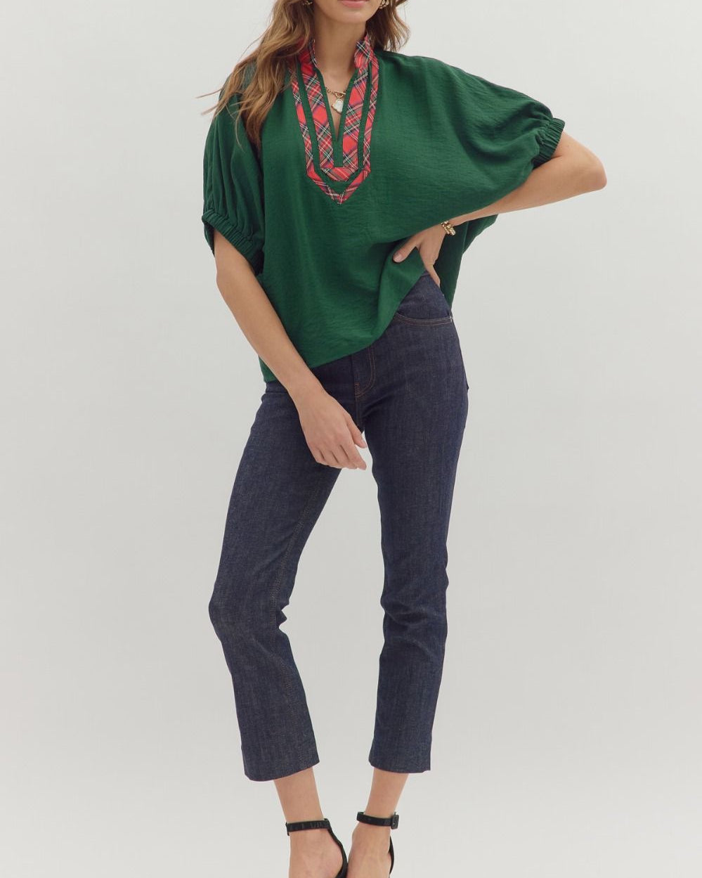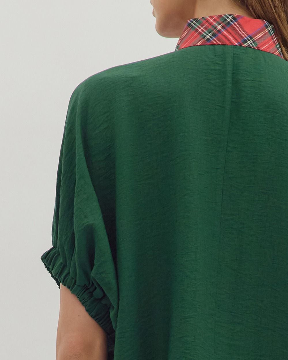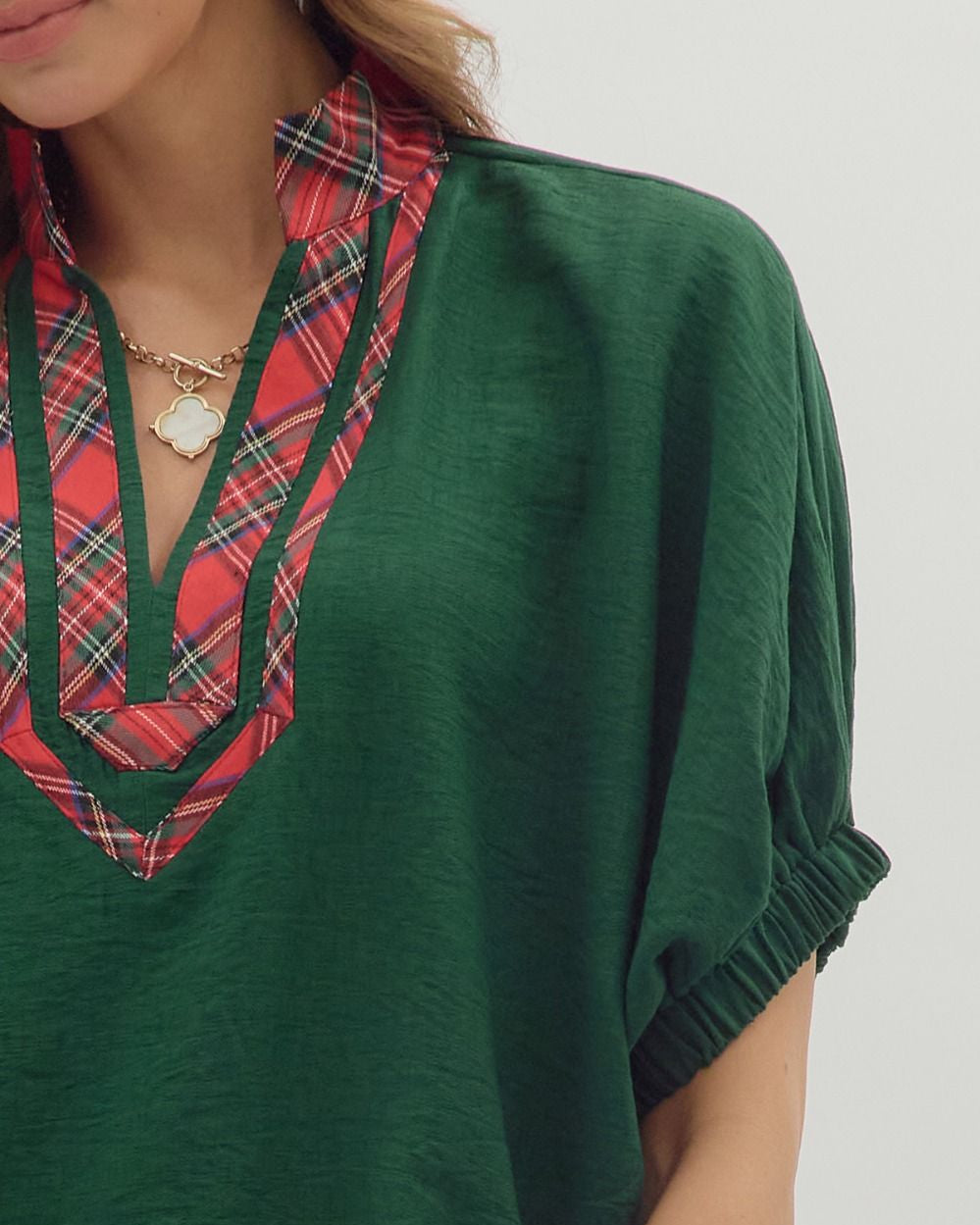 Solid short sleeve dolman top featuring plaid pattern contrast high V-neck band accent. Unlined. Woven. Non-sheer. Lightweight.