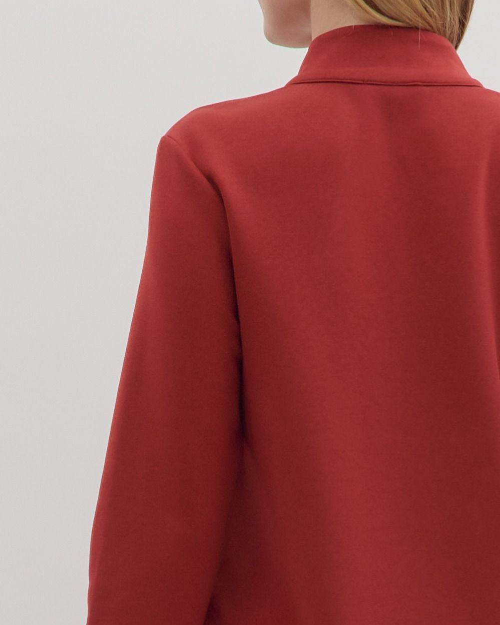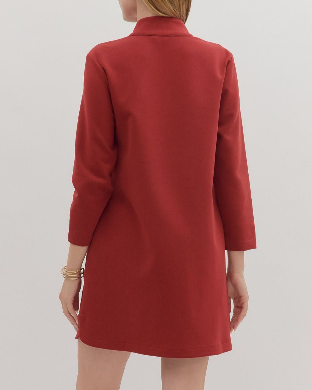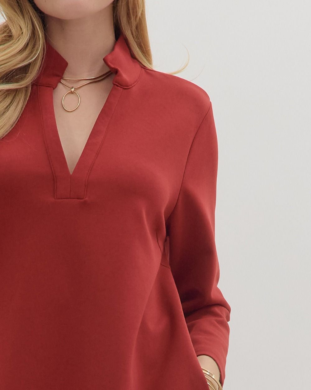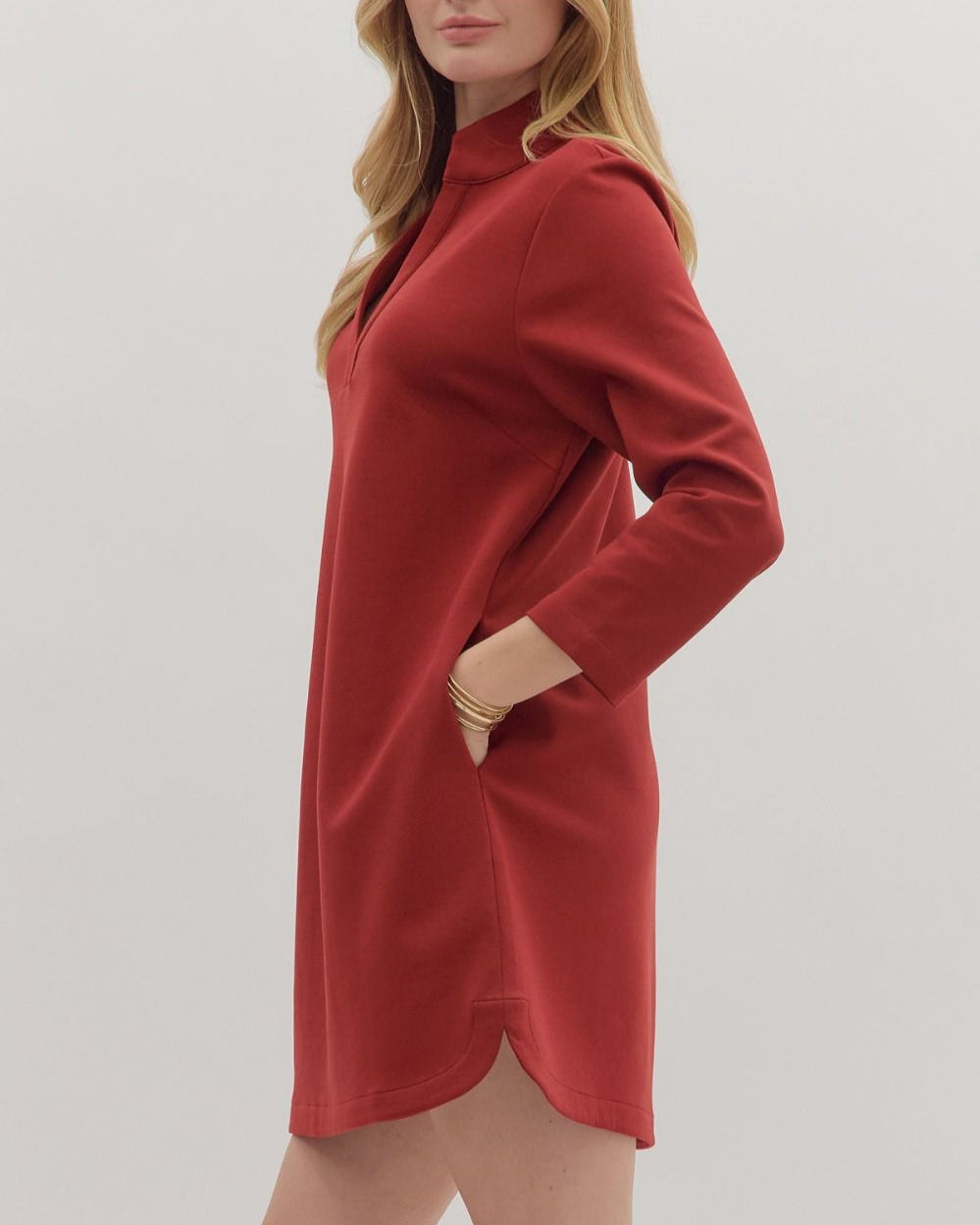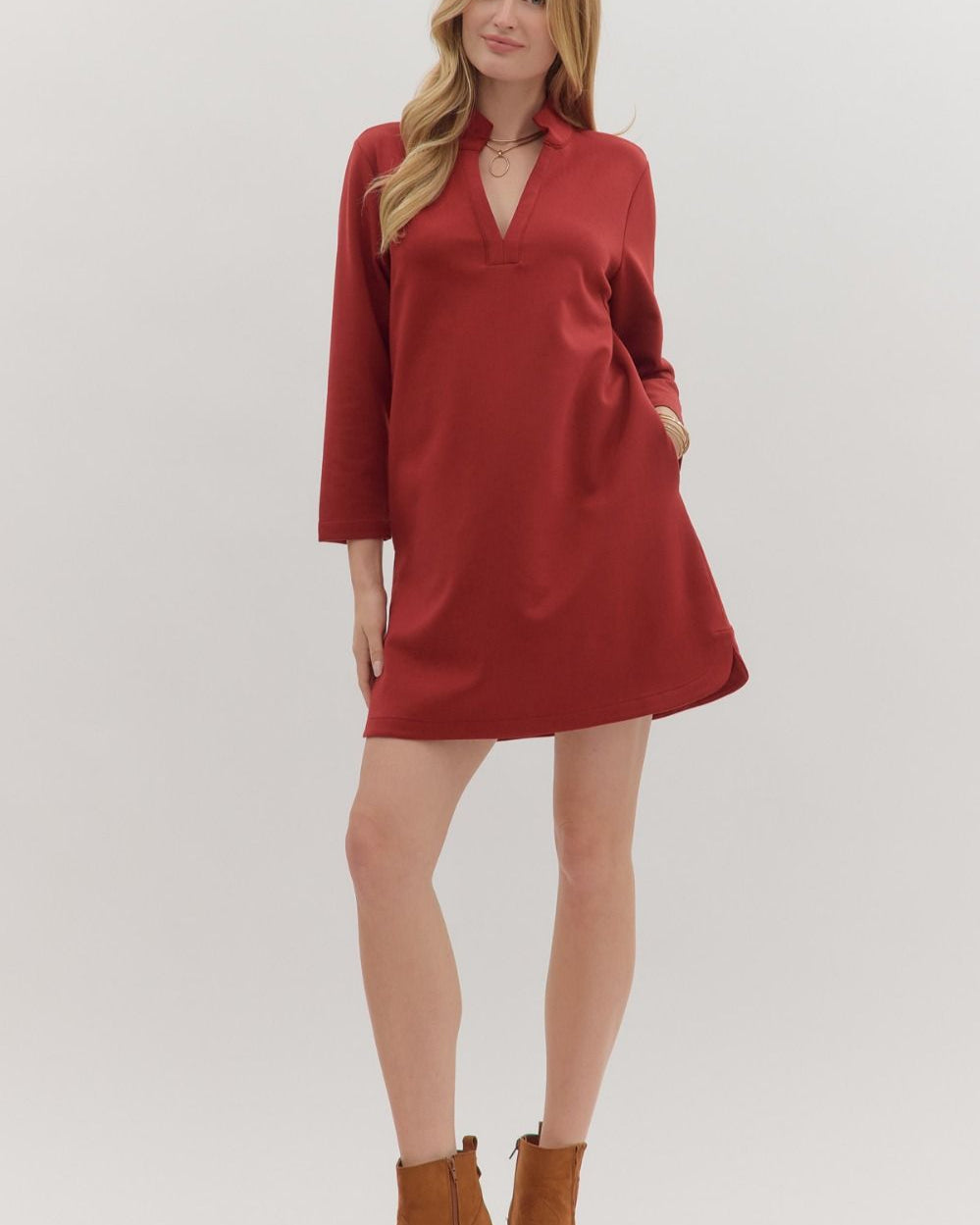 Solid long sleeve mini dress featuring split V-neck with stand collar. Side pockets. Unlined. Knit. Non-sheer. Light weight.