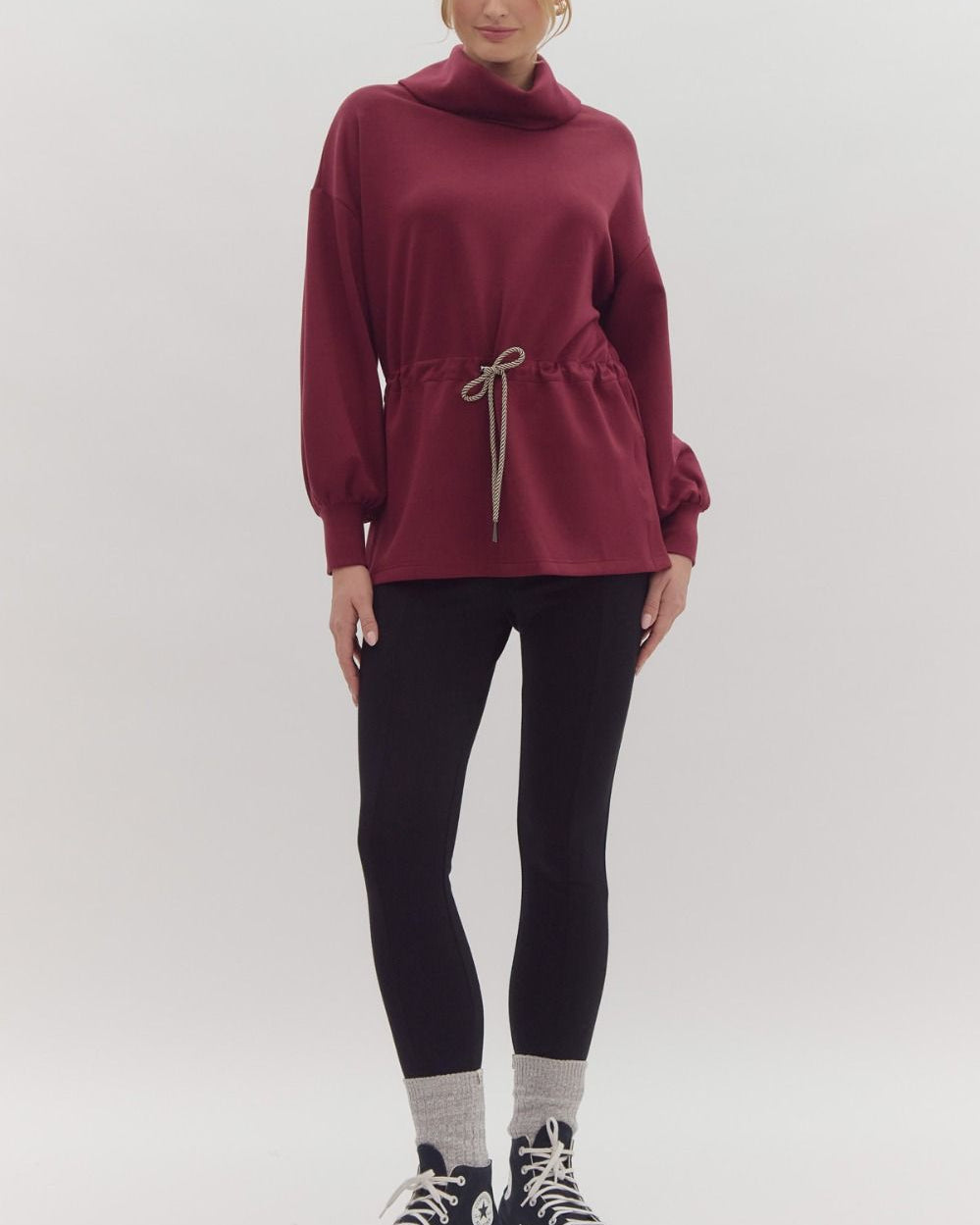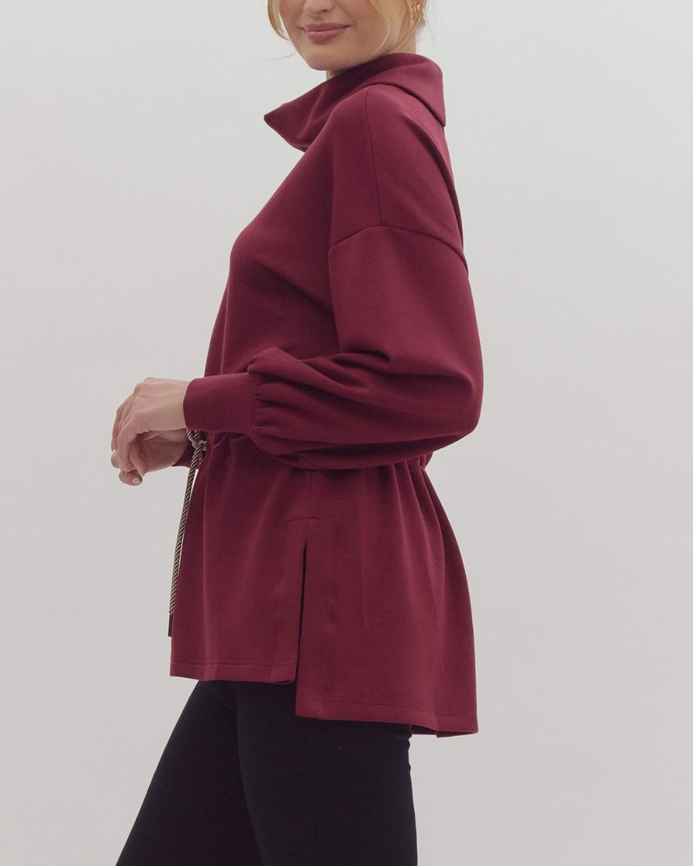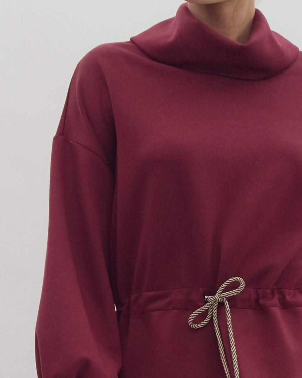 Solid long sleeve tunic featuring funnel neck slit at back. Adjustable toggle waist. Side slit at hem. Unlined. Knit. Non-sheer. Lightweight.